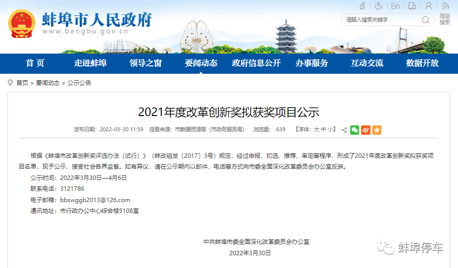 轉載:蚌埠市人民政府《2021年度改革創新獎擬獲獎項目公示》