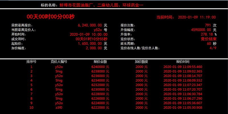 2020年1月9日在市公共資源交易平臺開展了網絡競價,我公司的花園油脂廠廠房及建筑物拆除權項目,公告期內共征集到19家符合要求的競買人,最終經過791輪的競爭出價,該項目以624萬元成交,較評估值增值459萬元,增值率達278.2%。