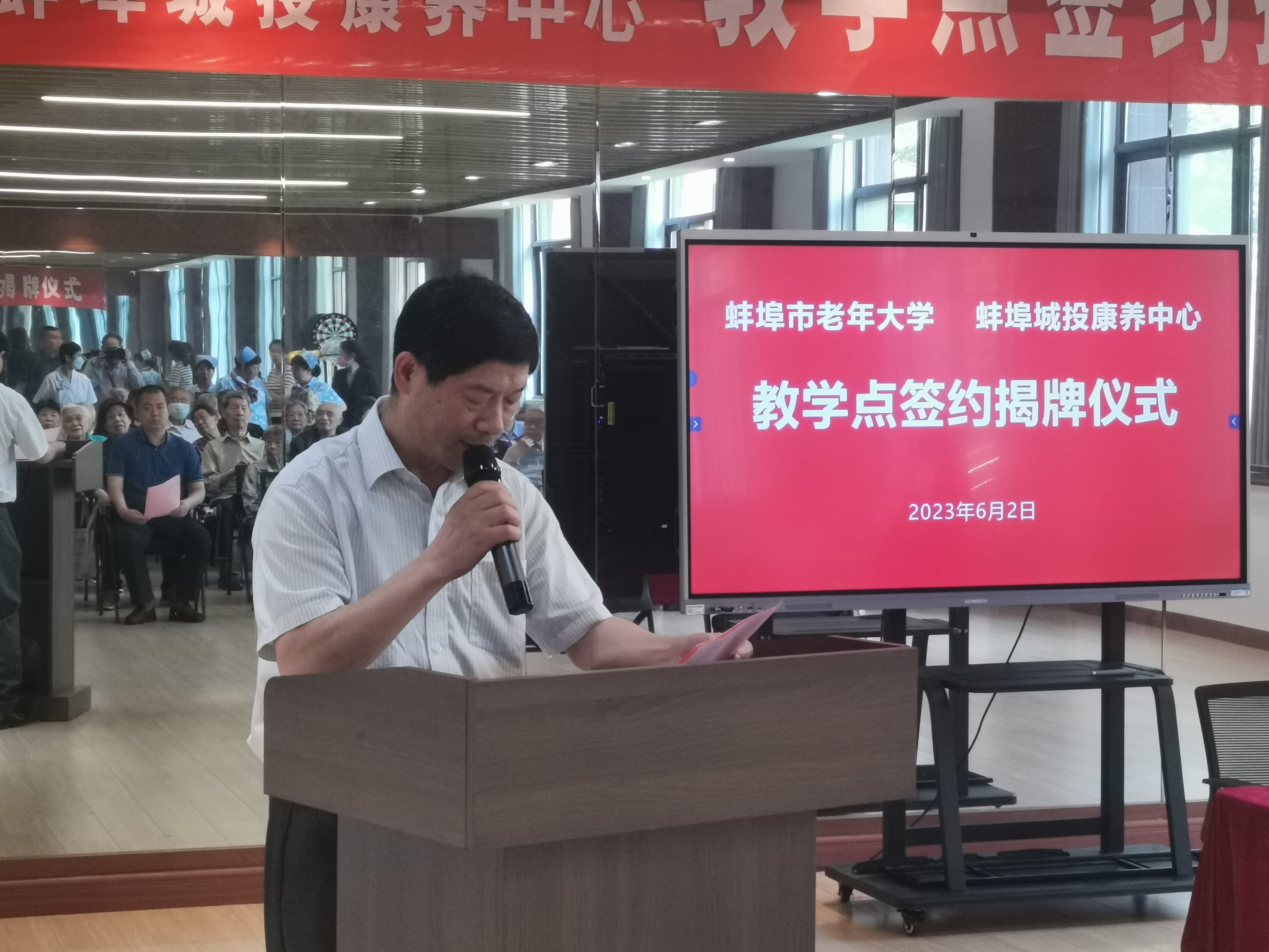 6月2日,蚌埠市老年大學城投康養中心教學點簽約揭牌儀式在蚌埠城投康養中心舉行。市委老干部局二級調研員、市老年大學副校長王茂;市城投集團公司黨委委員、副總經理,蚌埠市城投康養有限公司董事長倪宇望及城投康養公司領導班子成員出席揭牌儀式。儀式由蚌埠市城投康養有限公司總經理崔炎培主持。